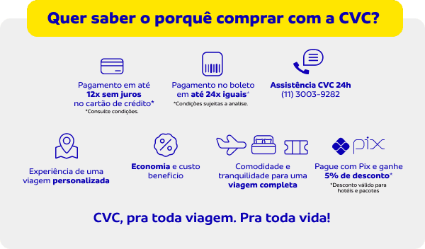 Condições de pagamento: as formas de pagamento a seguir são válidas apenas para as compras das ofertas aqui indicadas, exclusivamente em uma de nossas lojas físicas CVC, sujeitas a disponibilidade e às regras para aplicação de desconto. Parcelamento no cartão de crédito em até 12x sem juros. Os descontos mencionados já estão aplicados nos preços anunciados. | | | | | CVC Operadora e Agência de Viagens - CNPJ: 10.760.260/0001-19 | Rua da Catequese, 227, 11⁰ andar, sala 111, Bairro Jardim, Santo André/SP, CEP 09090-401 | | | | |